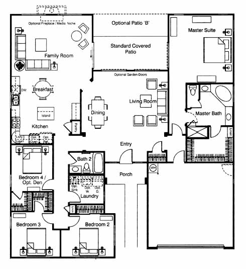 The large living and dining room greets you as you enter the home. To your left you'll find the 2nd, 3rd and 4th bedrooms, hall bath, kitchen with island and breakfast area and the spacious family room with optional fireplace and media niche. On the other side of the home you have the master suite and bath with dual vanities and a walk-in closet.