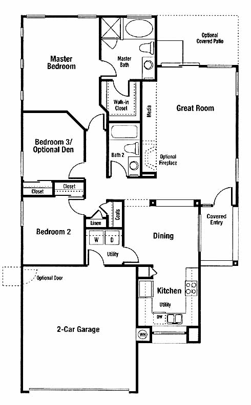 The spacious great room with optional fireplace and media niche greets you as you enter the home. Open to the great room is the kitchen with pantry and dining area. Just down the hall you'll find the 2nd and 3rd bedrooms, hall bath and the impressive master bedroom and bath with a walk-in closet.