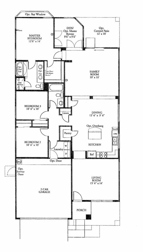 The large living room greets you as you enter the home. Next you'll come to the kitchen with dining area and optional overhang. From the kitchen you can access the family room, den, 2nd and 3rd bedrooms, hall bath and the master bedroom and bath with a walk-in closet.