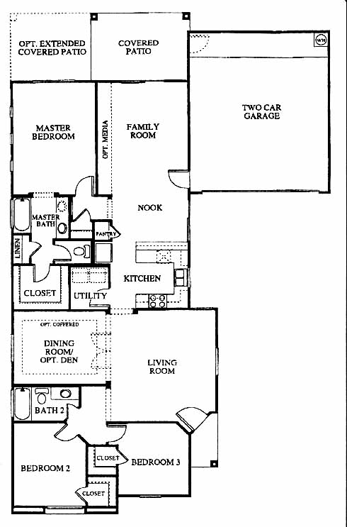 The large living room greets you as you enter the home. From the living room you can access the dining room, 2nd and 3rd bedrooms, hall bath and the kitchen with breakfast nook. The kitchen leads to the family room with optional media niche and the master bedroom and bath with a walk-in closet.