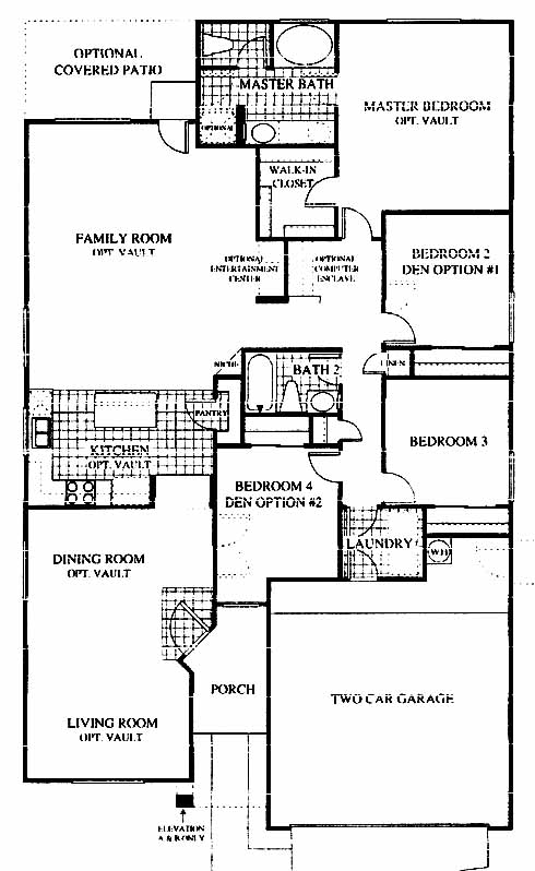 This is a nice flowing floor plan with a separate living room, family room, dining room and kitchen nook. The kitchen has a large pantry, an island and plenty of cupboard space. The Ironwood allows for two different den options to let you decide what is best for you. The optional computer enclave gives you a central place for your computer.