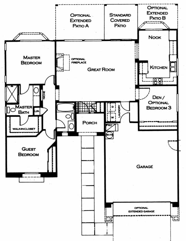 This two bedroom home has lots of fantastic features including a third bedroom or optional den with french doors. A touch of class is added with rounded corners and recessed lighting. The bathrooms are dressed with cultured marble vanity tops and single lever features. You can enjoy Arizona's famous sunsets from your standard covered patio.