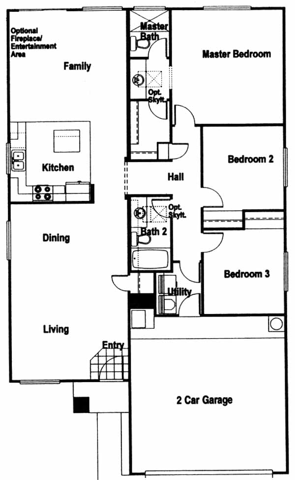 This three bedroom home with an island kitchen has luxury features included at an affordable price. Vaulted ceilings and rounded corners really open the living area and master bedroom. Designer lighting and tile entries ensure a bright and friendly home.
