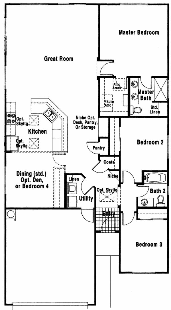 This three bedroom home with great room and dining has luxury features included at an affordable price. Vaulted ceilings and rounded corners really provide an open feel to the living area and master bedroom. A large walk-in closet is standard in the master bedroom. Designer lighting and tile entries ensure a bright welcome into the home.