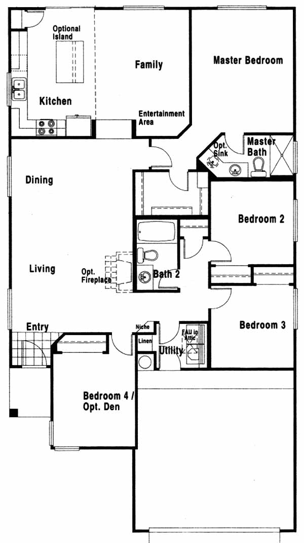 This four bedroom home with wrap around kitchen has luxury features included at an affordable price. Vaulted ceilings and rounded corners really provide an open feel to the living area and master bedroom. The separate family room and living room give versatility to your formal and casual living areas.