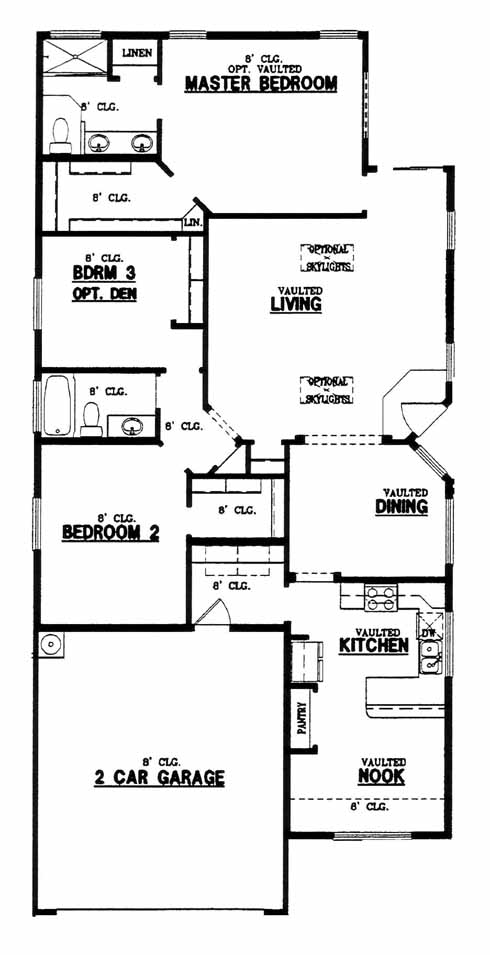 As you enter the home you'll step directly into the living room with optional fireplace and skylights. From here you can access the 2nd and 3rd bedrooms, hall bath, kitchen with breakfast nook, dining room and the master bedroom and bath with a walk-in closet.