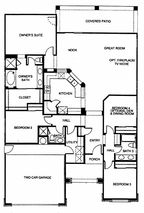 The entry takes you past the 2nd, 3rd and 4th bedrooms and into the great room with optional fireplace/t.v. niche. From here you can access the kitchen with nook and the owner's suite and bath with dual vanities.