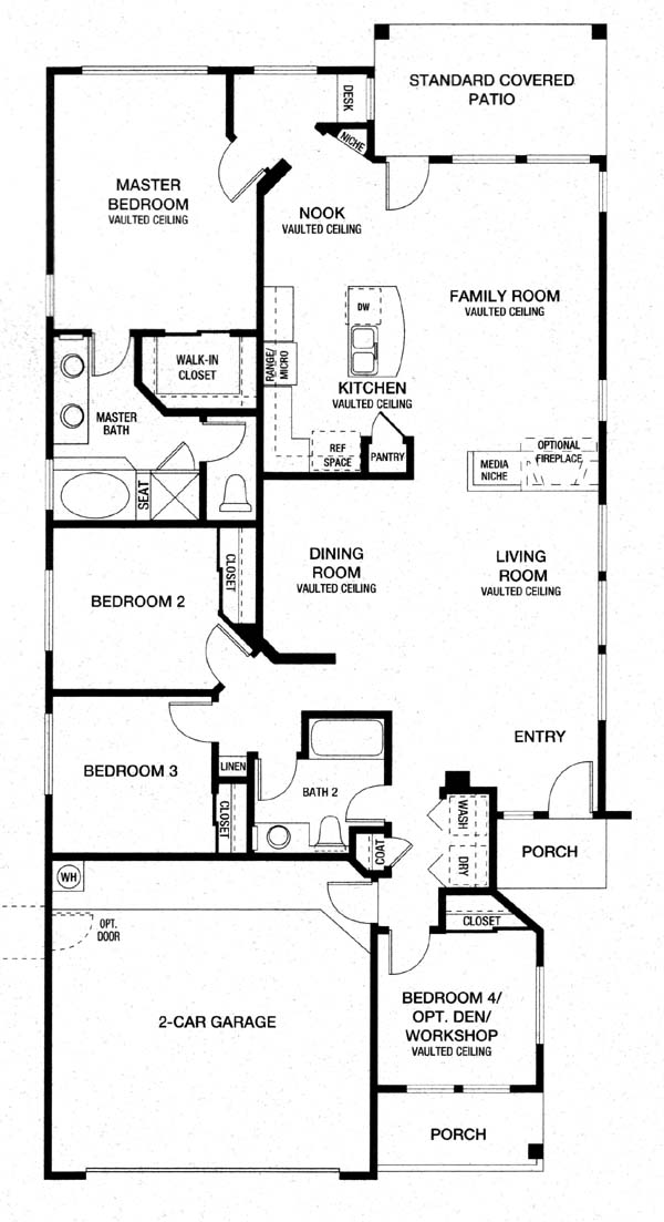 The entryway invites you into the formal, side-by-side living and dining area, expansive with its vaulted ceiling. This spacious, open design features a rear family room next to the gourmet kitchen with nook that guards the entrance to the near master suite area. The master suite features a walk-in closet and luxury bath that promotes the easy living lifestyle. Bedroom 4 can also be a den or optional workshop.