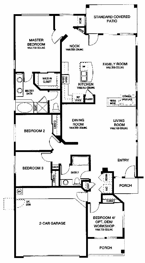 The large living and dining room greet you as you enter the home. From here you can access the 2nd, 3rd and 4th bedrooms and the family room with optional fireplace and media niche. Open to the family room is the kitchen with island, pantry and nook which leads to the master bedroom and bath.