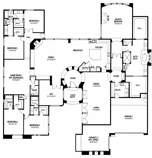 The foyer flanked by the den and the living and dining rooms takes you into the large family room with fireplace. Open to the family room is the kitchen with island, pantry and breakfast nook. To your right the 2nd foyer leads you into the massive master bedroom with optional fireplace and the master bath with dual vanities and his and her walk-in closets. On the other side of the home you'll find the 2nd and 3rd bedrooms with Jack and Jill bath, 4th and 5th bedrooms, each with their own bath and a spacious game room.