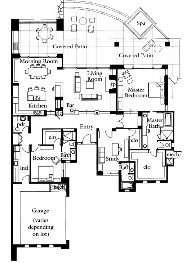 Professionally designed desert landscaping abounds at the entry to this contemporary home with split bedroom floor plan. Living room with fireplace and wet bar opens to island kitchen with morning room.
