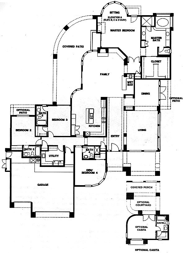 Take your pick. You may have 3 bedrooms and a den or 4 bedrooms and each has its own full bath. The heart of the house of Arizona Room of kitchen and family room open on the beautiful, curved patio as does the master suite. You also have a separate casita as an option.