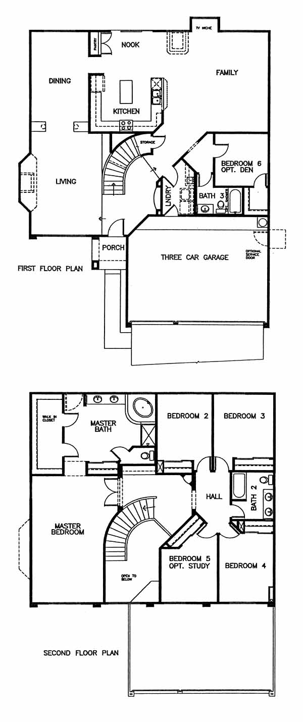 As you enter this home you are greeted by a beautiful and unique staircase. Great attention to detail is apparent in both the living room, which boasts a gorgeous fireplace, and the open dining room. The kitchen offers everything needed to entertain as well as an optional gourmet kitchen and fireplace between the breakfast nook and family room. On the first floor there is a bedroom (optional den) with adjacent bath and huge laundry room leading to to three car garage. As you ascend the staircase you are greeted by a plethora of bedrooms. There are four (one as optional study) and the immense master bedroom which comprises nearly half of the second floor. The double door entry opens to an expansive bedroom with optional bay. The luxurious master bath offers dual cultured marble vanities and garden tub. In addition, there are two doors which lead to the walk in closet and an optional door to an optional deck.
