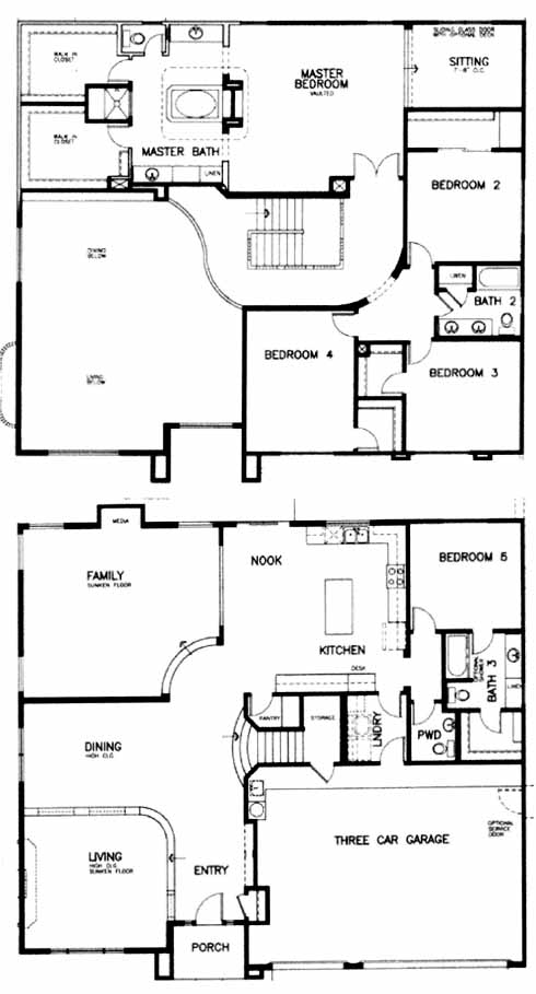 The entry takes you past the living and dining room and into the family room with media niche. Next you'll come to the kitchen with island and nook which leads to the 5th bedroom. Upstairs you have 3 spacious bedrooms, hall bath and the impressive master bedroom with sitting area and master bath with his and her walk-in closets.