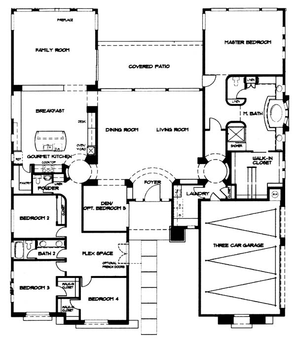 Inviting courtyard leads to a spectacular entry and formal foyer, twelve foot ceilings in the living areas, custom rounded wall and window corners, over-sized family room (per plan), cozy gas-burning fireplace, ceramic tile, gourmet kitchen, extra large food preparation island, spacious walk-in pantry (per plan), luxurious master bath with Roman oval tub, custom 'snail' shower with glass block surround, energy saving features, quality electrical features, and a security system.