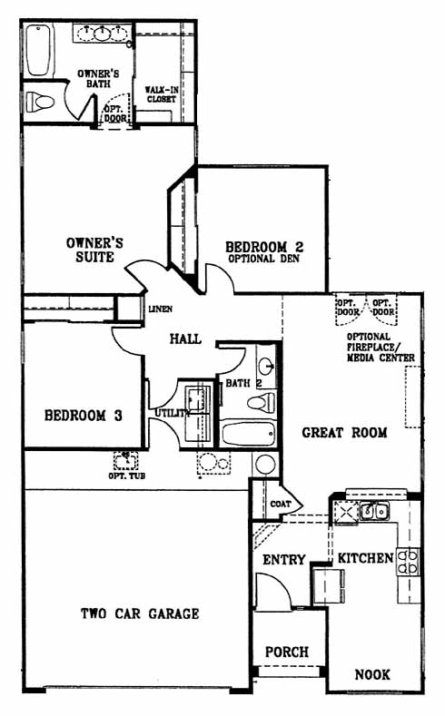 The entry takes you directly past the kitchen with nook and into the great room with optional fireplace. Down the hall you'll find the 2nd and 3rd bedrooms, hall bath and the owner's suite and bath with a walk-in closet.