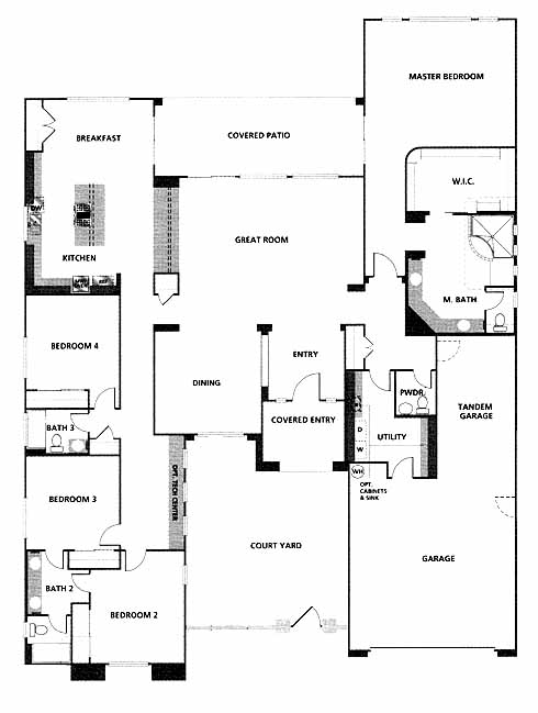 The entry takes you past the dining room and into the large great room. Open to the great room is the kitchen with island and breakfast nook. Down the hall you have the 2nd, 3rd and 4th bedrooms and the hall bath with dual vanities. On the other side of the home you'll find the master bedroom and bath with a walk-in closet.