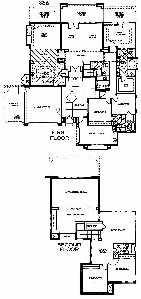 The distinctive Santa Fe style exterior boasts a private courtyard with two separate entrances into the home. The formal living and dining rooms open out to a large covered porch. A large master suite is situated on the same side of the home as the two downstairs bedrooms. Upstairs are two more bedrooms, a seating room and a bonus room, which overlooks the main entry. Corian countertops in the kitchen and laundry, eight-foot interior doors and solid wood stair rails are standard.
