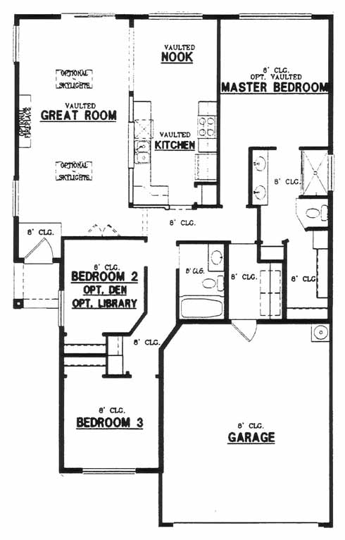 As you enter the home you'll step directly into the great room with optional fireplace and skylights. From here you can access the 2nd and 3rd bedrooms, hall bath, kitchen with breakfast nook and the master bedroom and bath with a walk-in closet.