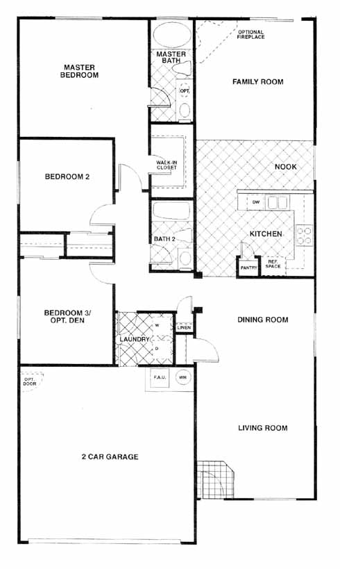 The large living and dining room greets you as you enter the home. From here you can access the 2nd and 3rd bedrooms, hall bath, the master bedroom and bath with a walk-in closet and the kitchen with nook which leads to the family room with optional fireplace.