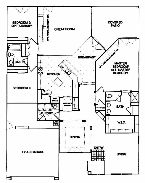 The tiled entry flanked by the living and dining room takes you past the master bedroom and bath and into the great room with optional fireplace/media center. From the great room you can access the covered patio, 2nd and 3rd bedrooms, hall bath and the kitchen with island, pantry and breakfast nook.