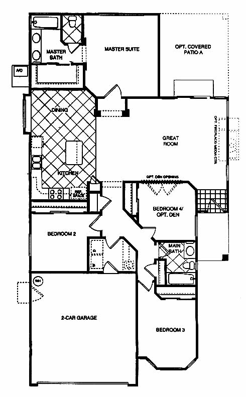 The tiled entry takes you directly into the large great room with optional fireplace/media center. Open to the great room is the kitchen with island and dining area. From the great room you can access the 2nd and 3rd bedrooms, den, hall bath and the master suite and bath with dual vanities and a walk-in closet.