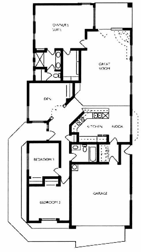 A unique design features a side entry into this home. The split floor plan accomodates three bedrooms and a den. A state of the art kitchen and nook area opens into the spacious great room, 12" by 12" ceramic tiles in the entry, kitchen, laundry and baths, hand troweled interior walls with rounded corners and quaint art niches. Customize this home with a fireplace in the great room or double doors opening into the den.