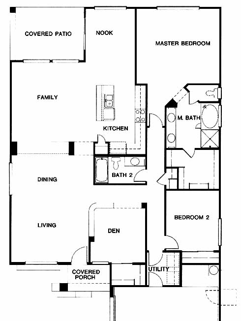 At 1,856 square feet, this home is designed for flexibility. Enter through a covered porch into the formal living and dining area. The kitchen and nook area opens onto the family room as well as the covered back patio. The kitchen also features a large island, Merillat oak cabinetry, and a pantry. Off the living room, a space has been designed for either an open den or a third bedroom. The master suite offers a bay window option and comes standard with a large walk-in closet, dual sinks and a separate tub and shower in the master bath. Custom options include Corian, tile, granite or marble counter tops, fireplace and a whirlpool bath.