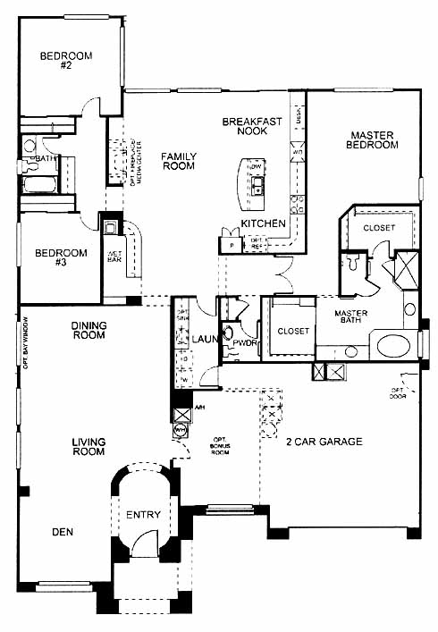 The entry takes you past the den and into the large living and dining room area. Next you'll come to the family room with optional fireplace/media center. Open to the family room is the kitchen with island and breakfast nook. From the family room you can access the 2nd and 3rd bedrooms, hall bath and the master bedroom and bath with a walk-in closet.