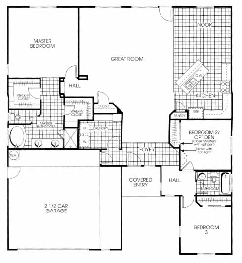 To your immediate right as you enter the home is the 2nd and 3rd bedrooms and hall bath. Next you'll enter the massive great room. From the great room you can access the tiled kitchen with island breakfast nook and the master bedroom and tiled bath with his and her walk-in closets.