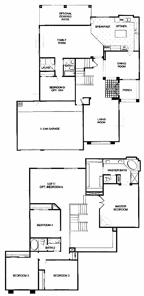 The tiled entry flanked by the living and dining room takes you into the family room with optional fireplace. >From here you can access the 5th bedroom and the kitchen with island and breakfast nook. Upstairs you'll find the 2nd, 3rd and 4th bedrooms, hall bath, loft area and the master bedroom and bath with a walk-in closet.