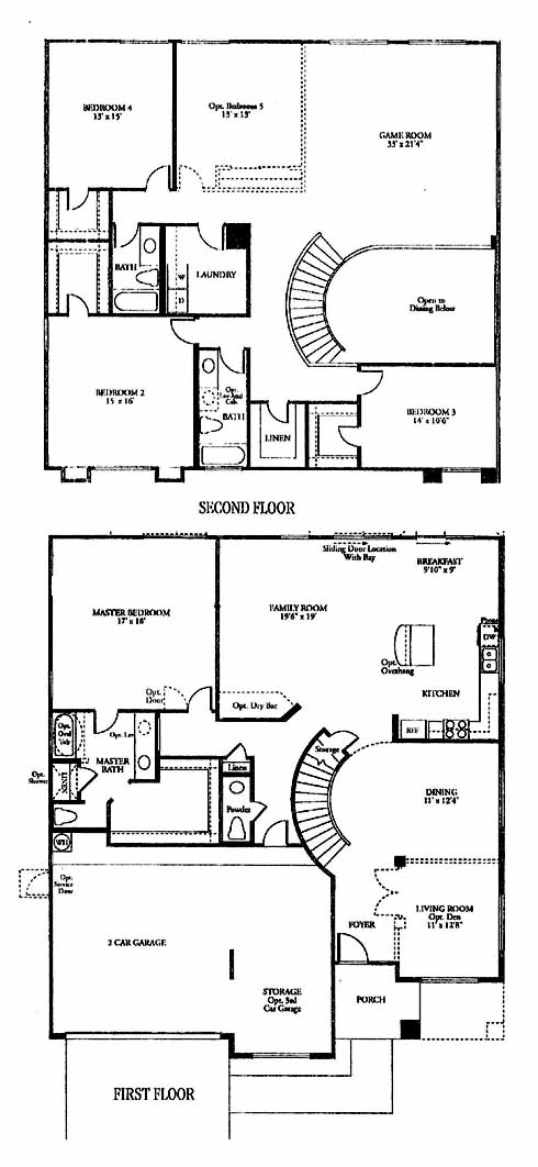 The foyer takes you past the living and dining room and into the large family room with optional dry bar. From the family room you can access the kitchen with breakfast area and the master bedroom and bath with optional dual vanities. Upstairs you'll find the 2nd, 3rd and 4th bedrooms, hall bath and spacious game room.