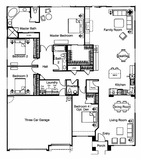The large living and dining room greets you as soon as you enter the home. Next you'll come to the kitchen with island and breakfast area which is open to the family room with optional fireplace and media niche. Also accessible from the kitchen is the 2nd and 3rd bedrooms, hall bath and the master bedroom and bath with dual vanities.