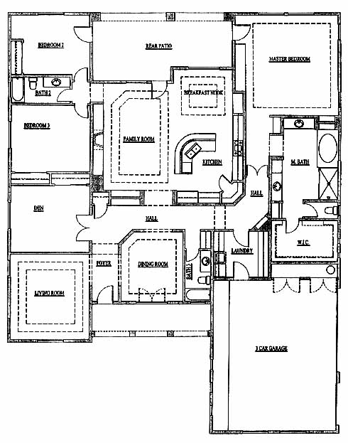 The foyer flanked by the living and dining room takes you past the den and into the spacious family room. Open to the family room is the kitchen with pantry and breakfast nook. From the family room you can access the rear patio, 2nd and 3rd bedrooms, hall bath and the massive master bedroom and bath with dual vanities and a walk-in closet.