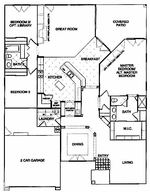 The tiled entry flanked by the living and dining room takes you past the master bedroom and bath and into the great room with optional fireplace/media center. From the great room you can access the covered patio, 2nd and 3rd bedrooms, hall bath and the kitchen with island, pantry and breakfast nook.