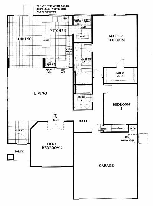 Two bedroom, den (optional 3rd bedroom), 2 bath, 2 car garage, owner's suite with master bath including dual sinks and a huge walk-in closet. The spacious kitchen overlooks the dining room and has a walk-in pantry off of it with the laundry room. As you enter this model you will walk into the living area and the den is off to the right.