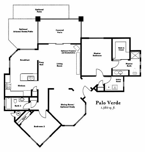 Two bedroom, 2 bath, 2 car garage, master suite and bath with a huge walk-in closet, spacious kitchen has a bar and breakfast nook overlooking a pony wall into the living area. The dining room (optional den)is located in a wonderful room off of the entry. This plan offers an optional Arizona room and patio. Standard features include lofty ceilings, rounded corners and knock down texture, cultured marble vanity tops and shower/tub surrounds, R-38 insulated ceilings, R-22 / R-24 insulated walls or block construction (per plan), and masonry 3 ft patio walls (per plan).