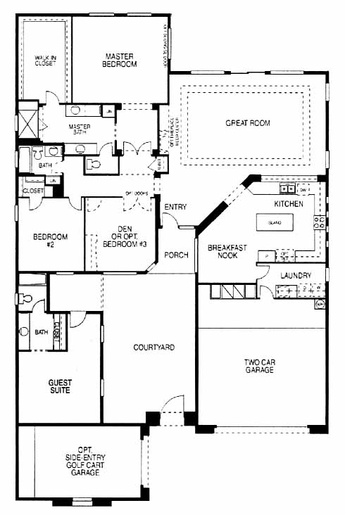 The courtyard takes you past the guest suite with bath and into the home. The great room greets you as you enter. From the great room you can access the kitchen with island and breakfast nook, 2nd bedroom, den and the master bedroom and bath with dual vanities.