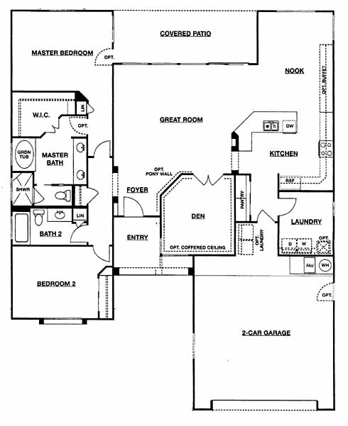 To your immediate left as you enter the home is the 2nd bedroom, hall bath and the master bedroom and bath with a walk-in closet, shower and garden tub. Next is the great room with optional pony wall. From the great room you can access the den and the kitchen with pantry and breakfast nook.