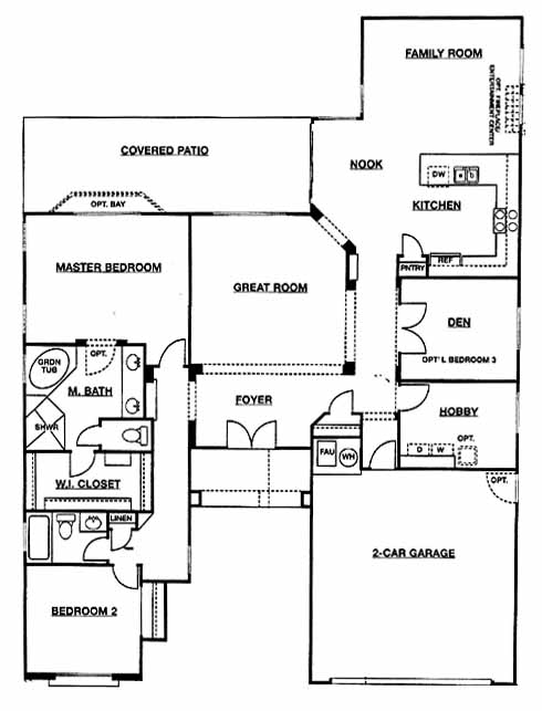 The foyer takes you into the large great room. Next you'll come to the family room with optional fireplace/entertainment center. Open to the family room is the kitchen with pantry and breakfast nook. Down the hall you'll find the den and the hobby room. On the other side of the home you'll find the 2nd bedroom, hall bath and the master bedroom and bath with a walk-in closet.