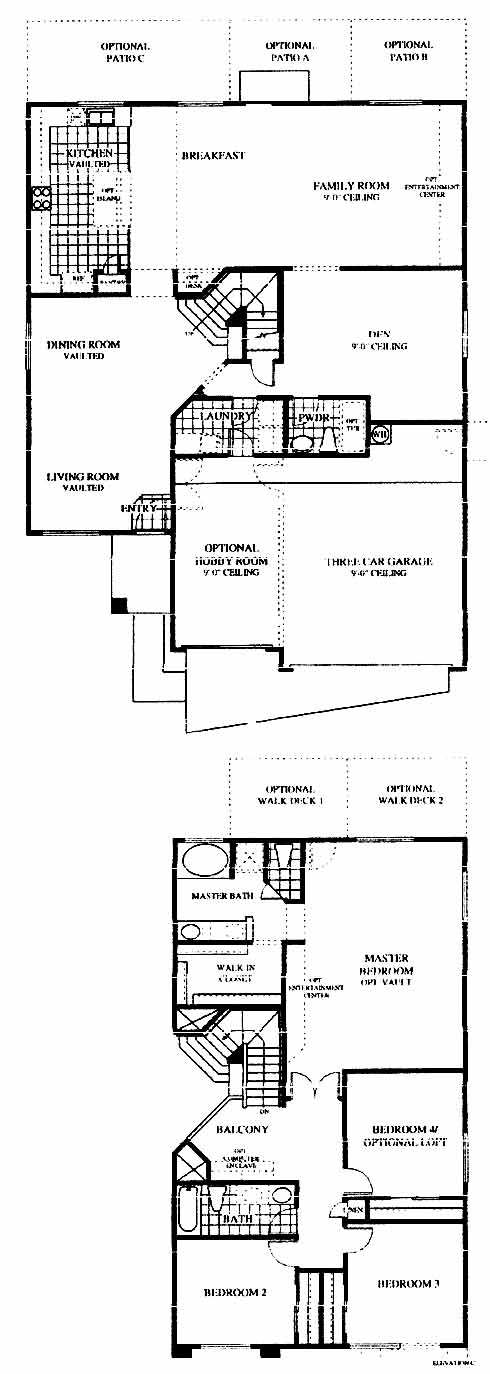 Talk about a huge beauty! Downstairs holds the vaulted living, dining room and kitchen. The kitchen has a long stretch of counter and cupboard space to allow for plenty of storage. The family room and den are a standard 9' ceiling. The den can either be a 5th bedroom or an extended family room. Upstairs has 4 bedrooms or 3 bedrooms with a loft area. The master does have an optional deck feature. This master is large enough for a complete bedroom set and a sitting area.