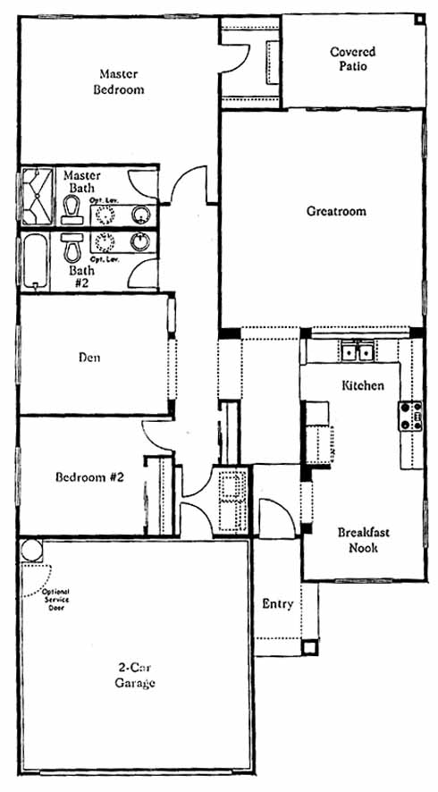 The entry takes you directly past the kitchen with breakfast nook and into the great room. From here you can access the covered patio, 2nd bedroom, den and the master bedroom and bath.