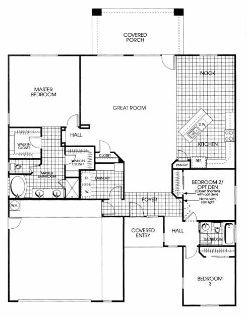 To your immediate right as you enter the home is the 2nd and 3rd bedrooms and hall bath. Next you'll enter the massive great room. From the great room you can access the tiled kitchen with island breakfast nook and the master bedroom and tiled bath with his and her walk-in closets.