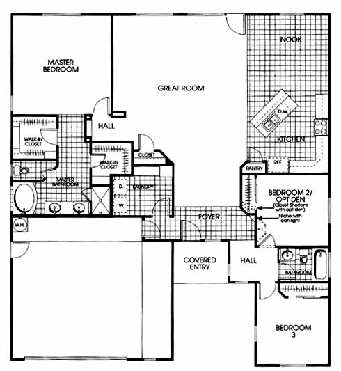 To your immediate right as you enter the home is the 2nd and 3rd bedrooms and hall bath. Next you'll enter the massive great room. From the great room you can access the tiled kitchen with island breakfast nook and the master bedroom and tiled bath with his and her walk-in closets.