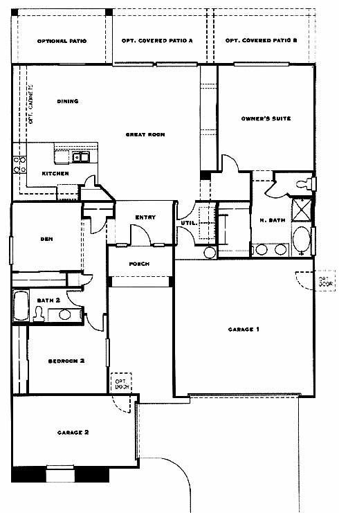 This 1,547 sq', split plan, two-bedroom, two-bath home with great room features 2 separate garages, plus a den or optional third bedroom. The flexible design allows for the easy transformation of the single garage space into a workshop, a storage area, or even a fourth bedroom. This bright and airy floor plan features a tiled entryway and nine-foot ceilings to accommodate plenty of natural light. Sliding glass doors lead from the conjoined great room, kitchen and dining room to optional covered rear patios. Additional options include a dining room bay window, master bedroom bay window, and a fireplace.