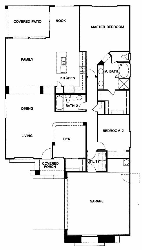 At 1,856 sq', this single-story plan is designed for flexibility. From the covered porch you enter a large living/dining area. Around the corner a comfortable space has been designed as an open den or as an optional third bedroom. The kitchen and breakfast area has a large island and opens to the family room and then onto a covered patio. The master bedroom with spacious bath lies in the rear of the home. Down the hall a second bath serves the second bedroom that sits next to the utility room which is easily accessed from the two-car garage. Options include a fireplace, a bay window in the master bedroom, plus the included den can be built as an optional third bedroom.