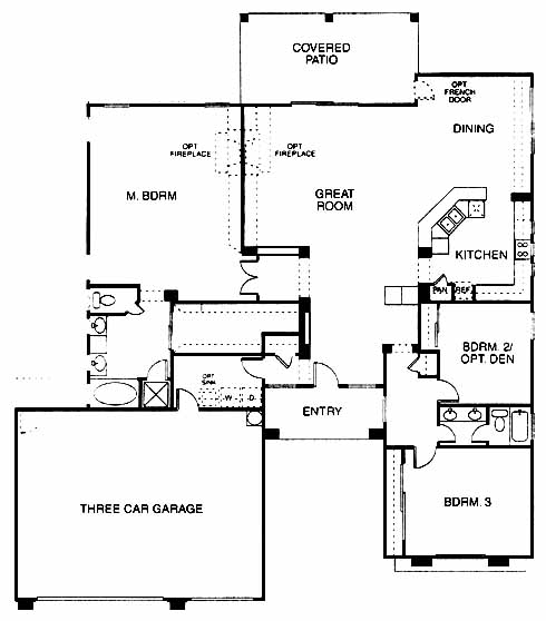 The entry takes you past the 2nd and 3rd bedrooms and into the large great room with optional fireplace. Open to the great room is the kitchen with dining room. Also accessible from the great room is the 2nd and 3rd bedrooms, hall bath and the master bedroom and bath with dual vanities.