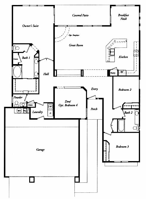 An eight-foot door leads into the foyer of this spacious great room floor plan. Large windows look out to the covered patio, which is accessible from both the owner's suite and nook. This split floor plan features ceramic tile in the kitchen, bathrooms, laundry, and front entry. The kitchen comes complete with a pantry, a choice of track or recessed lighting, 42" upper cabinets and roll-out shelves in the base cabinets. Additional features include a choice of one of three styles of paneled interior doors, hand textured walls and ceilings with rounded corners and spacious open volume ceilings.