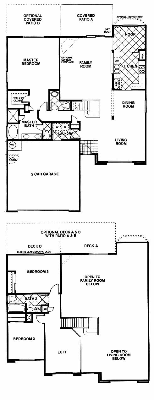 This two-story home offers a choice of three bedrooms and a loft area or four bedrooms. The master bedroom is located separate from the others, downstairs. Soaring ceilings in both the living and family rooms create a feeling of spaciousness. Distinctive features throughout this home include 12" by 12" tiles in the entry, hock and trowel finish with rounded corners and raised two panel doors throughout the interior. Customize this home by extending the covered patio along the family room, adding a third bathroom or a fireplace in the family room.