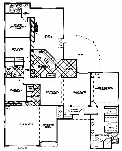 Twelve foot ceilings add to the spacious feeling in all the living areas. A split floor plan separates the three bedrooms from the master suite. The contemporary kitchen includes ceramic tile, 42" oak raised panel or recessed maple cabinets, corian countertops, and cast iron double bowl kitchen sink. Some of the other custom features for this home include a three car garage, optional bonus room, eight-foot interior doors, round drywall corners and 2x6 construction.